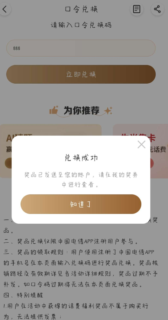 电信App-我-我的奖券->右上角口令兑换分别输入以上口令,进行兑换,兑换完后记得使用