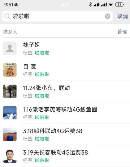 2.在通讯录首页上方的搜索框刚才新建的标签,点击下方的更多联系人。