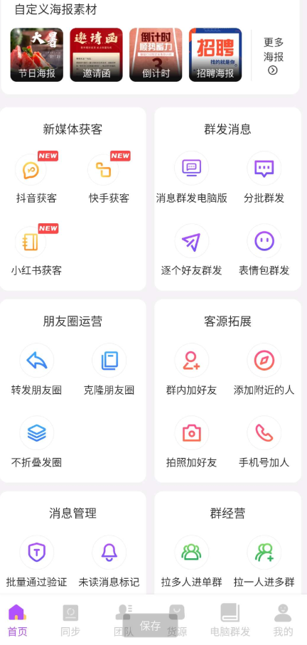 可以批量把你的素材同步到他们自己的团队和他们的朋友圈;一键从微信朋友圈、淘宝、京东、阿里巴巴等平台导入商品素材。