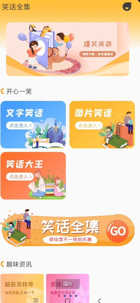【软件介绍】它包含多种类型笑话及段子、图片、视频等,界面简洁操作易,可收藏分享,且定期更新 。还有幽默笑话大全app,海量资源实时更新