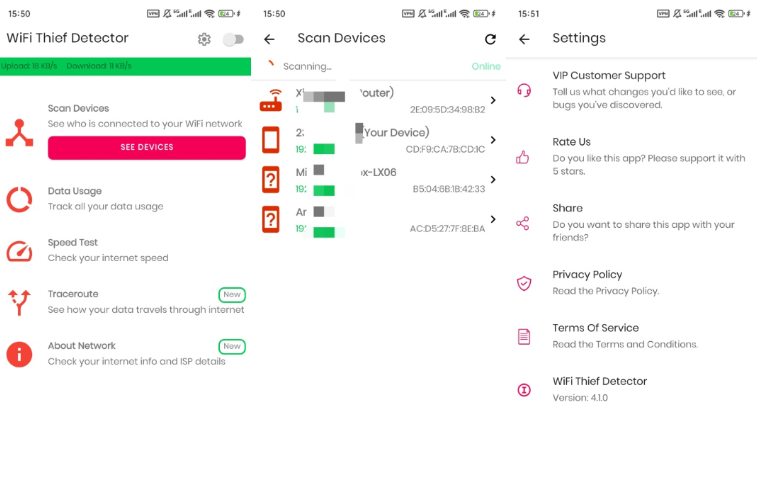 【官方介绍】:WiFi 窃贼探测器是一款为安卓设备设计的实用应用,使用户能够检测并识别连接到家庭 WiFi 网络的设备。利用先进的网络流量分析技术,该应用允许用户查看当前所有访问其网络设备的全面列表。关键功能包括查看每台连接设备的IP地址、MAC ID和厂商信息,以及连接状态,为网络使用情况及潜在未经授权访问提供宝贵洞察。